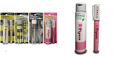 Dデザイン:詰め替えボトルは白にピンクの豹柄(大阪発、某アイドルユニットのユニフォーム?)、ペン型スプレーは応援ユニフォームのショッキングピンクにプッチ柄!浪花のトラギャル必見、スペシャルピンクバージョン。