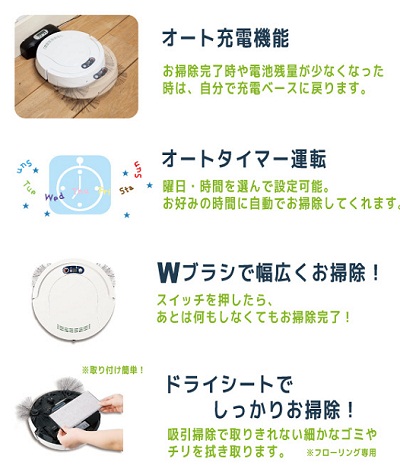 ツカモトエイム RobotCle ¥19,800(税込) お部屋のお掃除はすべて、ワタシにお任せください♪新しくなったお掃除ロボットクリーナーデラックス。オート充電機能やリモコン機能、ふき掃除に便利なドライシートで細かなゴミやチリまでしっかりお掃除! ! 充実した機能で更にパワーアップして新登場!きれいな部屋で、毎日… |